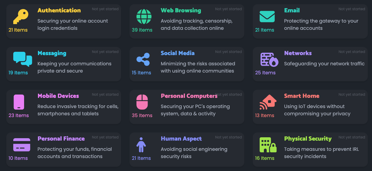 In the image above you can see a checklist from the website and it is broken down into 12 distinct pillars covering various areas of digital life and privacy, you can start anywhere you like, depending on what is most relevant or important to you.
