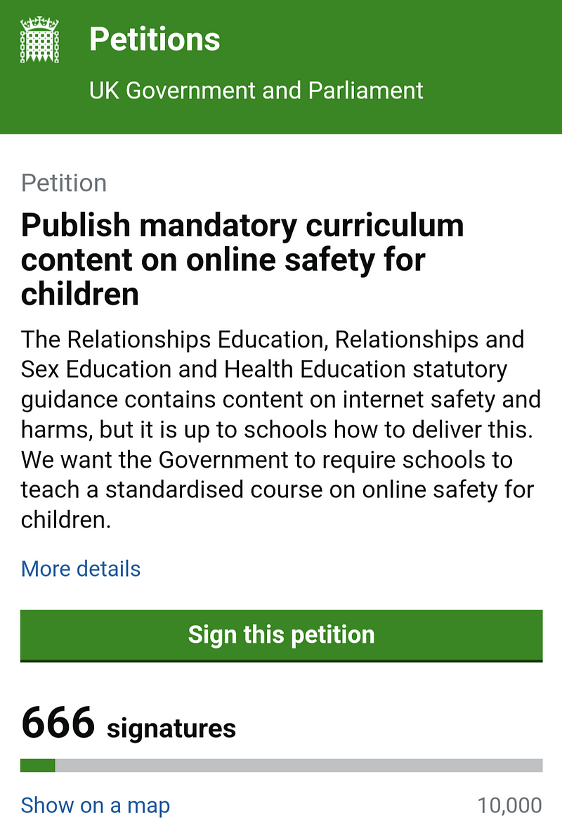 Petition: Publish mandatory curriculum content on online safety for childrenThe Relationships Education, Relationships and Sex Education and Health Education statutory guidance contains content…petition.parliament.uk