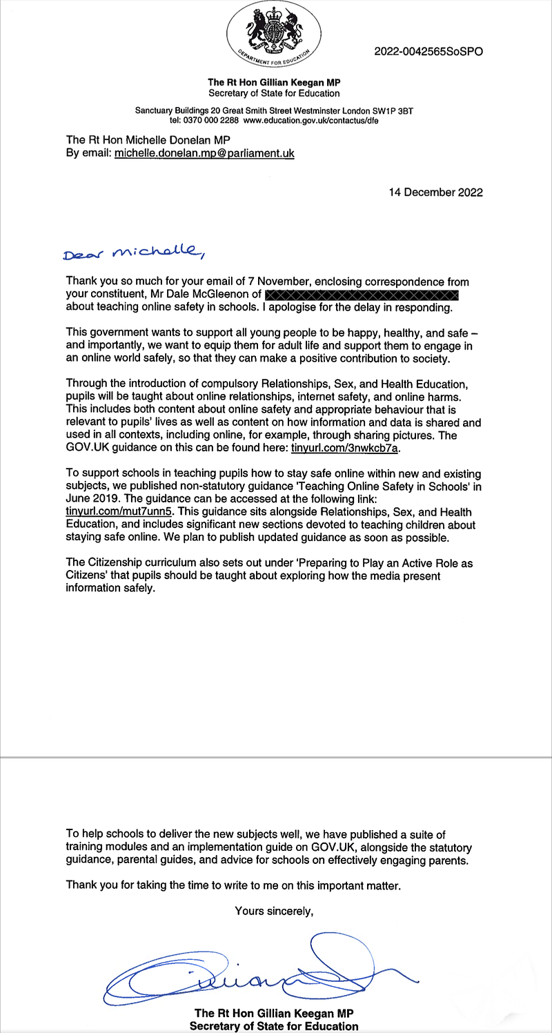 Before Christmas, I spoke to my local MP Michelle Donelan whilst she was knocking on doors and meeting the local constituents. I took the opportunity to chat with her about my efforts over the years to help educate people on the subject of online child safety and also raised the issue that the subject was not on the official curriculum for primary and secondary schools in the UK. Michelle told me that somebody would reach out for more detail and to my surprise, somebody from her office did indeed reach out to me. and after I provided some more detail they stated that Michelle was happy to write to the Secretary of State for Education on my behalf.