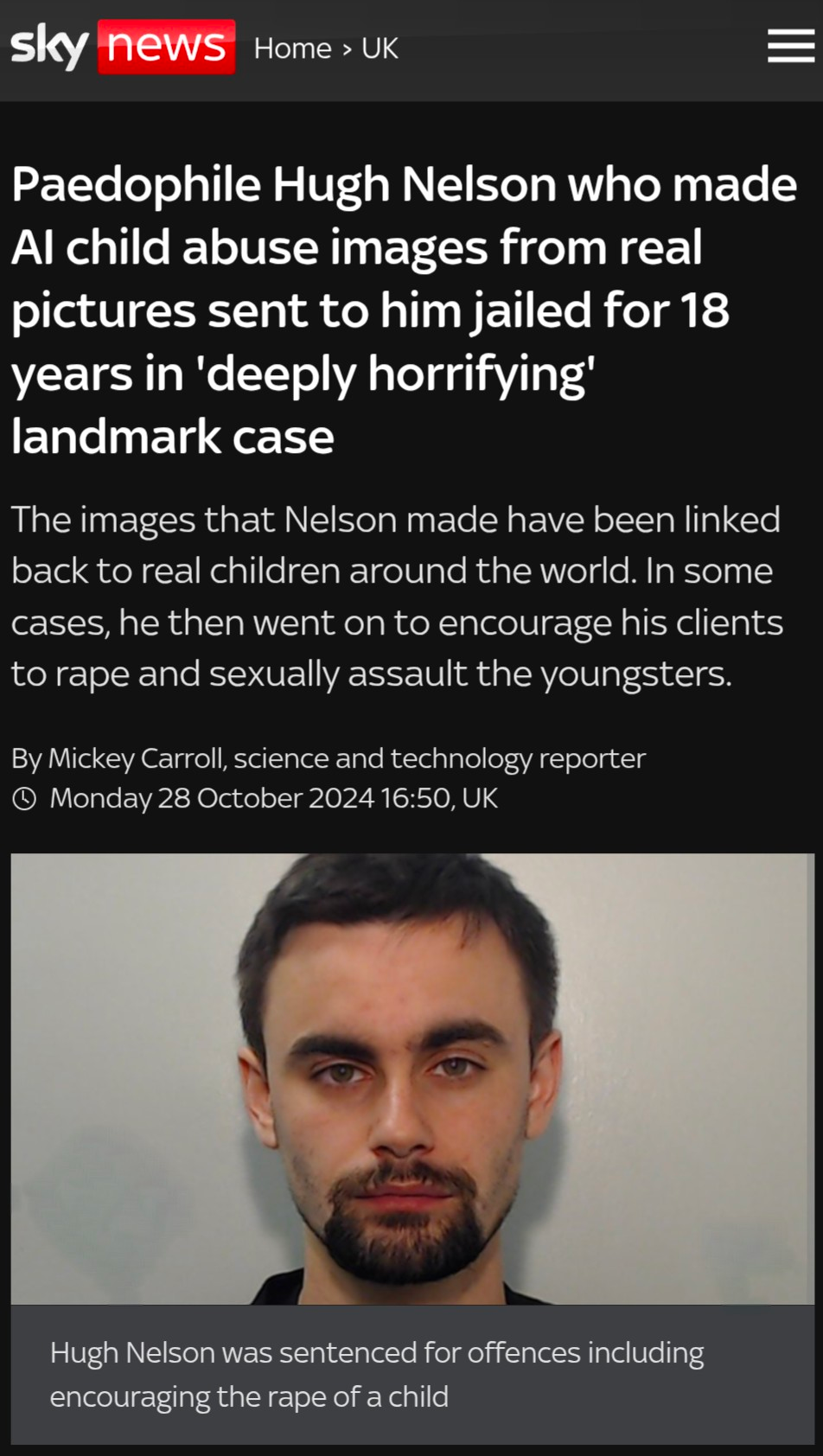 A very recent case that highlights this perfectly was the paedophile Hugh Nelson who was sentenced to 18 years in prison for creating child abuse images using AI and real pictures of children. Nelson used a 3D character generator to turn ordinary pictures of children into child abuse images, before selling them on an internet forum used by artists. He charged his network of paedophiles £80 for a new "character" and £10 per image to animate them in different, explicit positions. Nelson made around £5,000 from selling these images over an 18-month period. In some cases, Nelson encouraged his clients to rape and sexually assault the children. The images that Nelson made have been linked back to real children around the world.