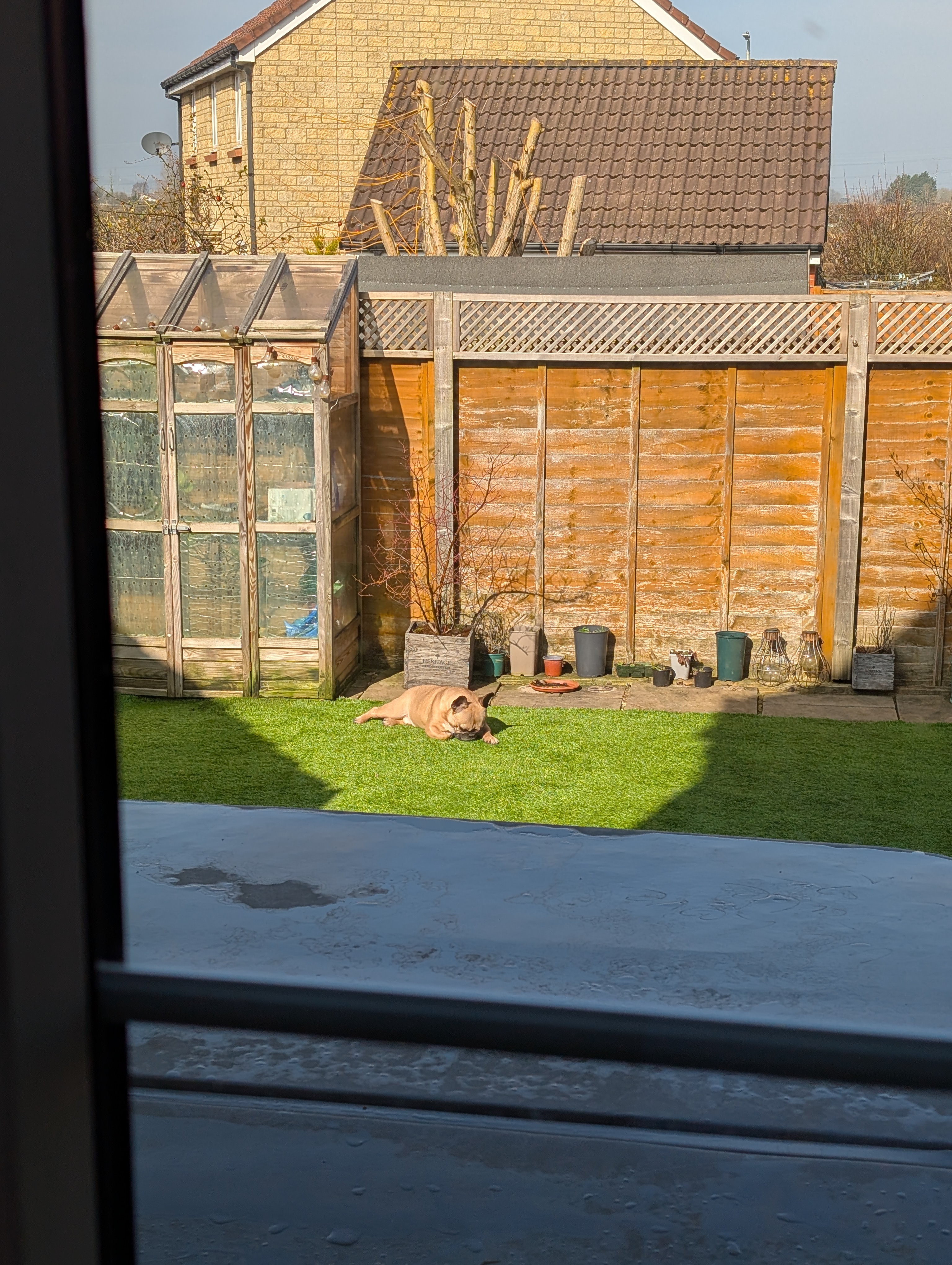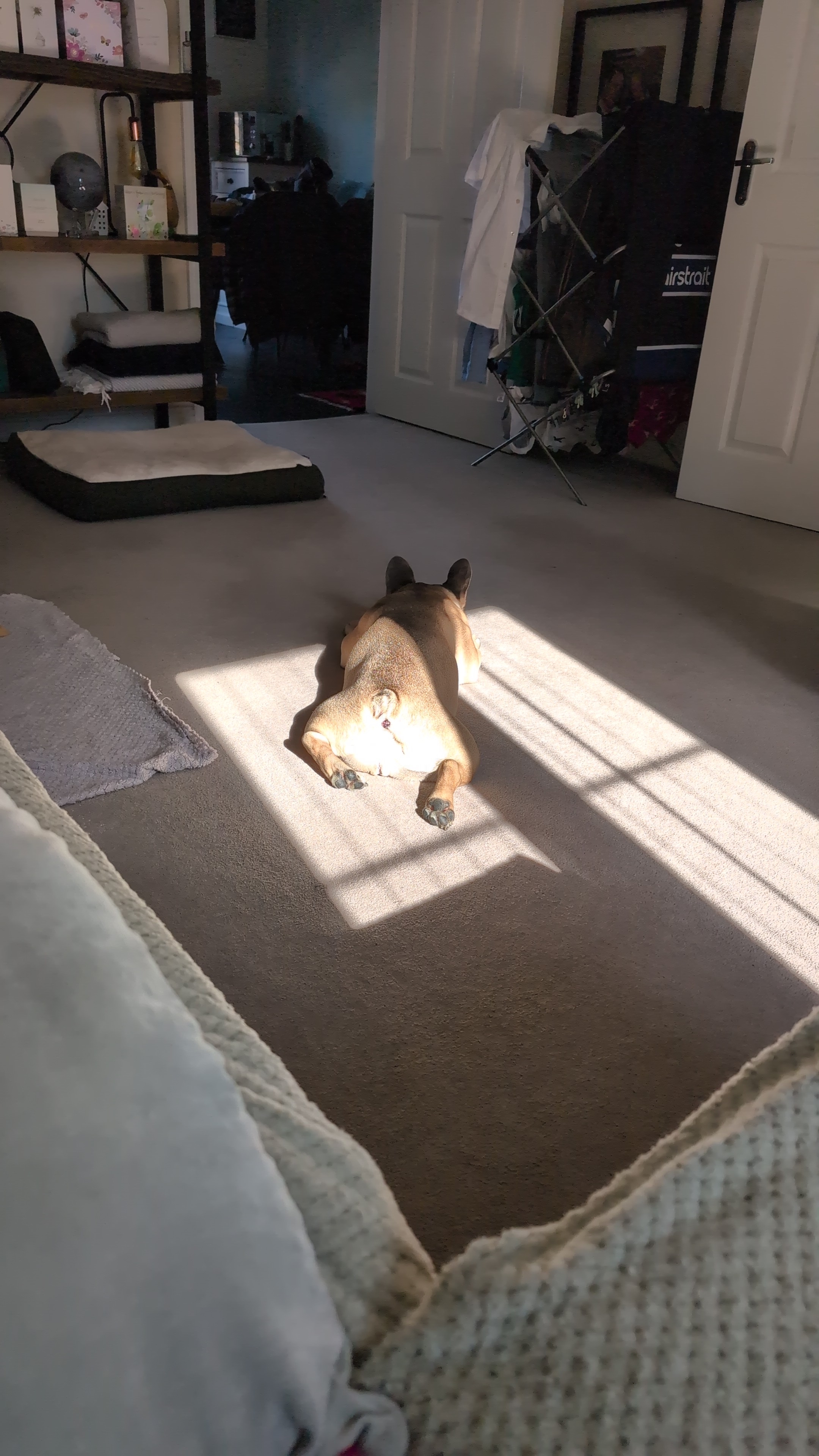 Middle row and Leffe has been getting very excited about the changing weather, many of you know that his favourite pastime is to conserve energy by napping on one of his many beds, but his favourite thing to do is to seek any sunshine and nap in that instead!