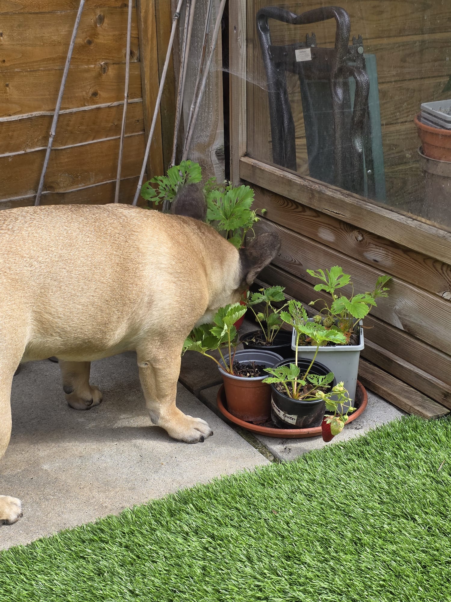 Colleen treated him to a strawberry as he has been doing so well tending to them.