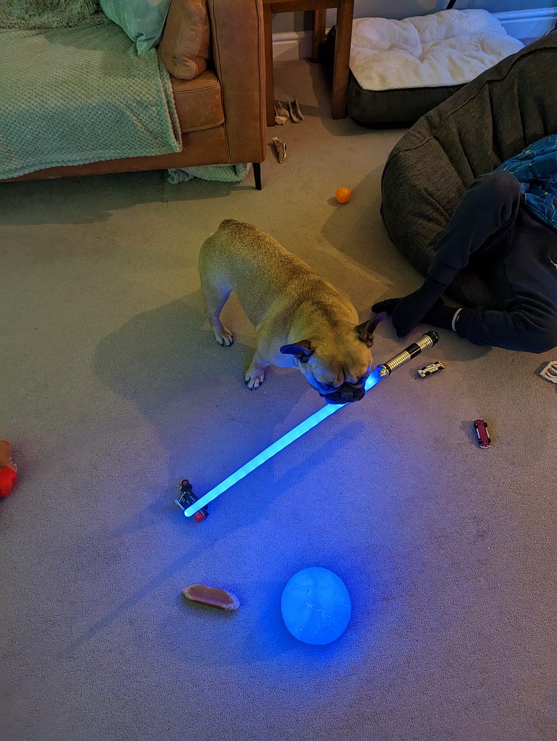 #starwars the force is strong 😂Leffe loving my light saber!#starwars #theforceisstrong #jedi #leffe #pets #frenchie #bulldogyoutube.com
